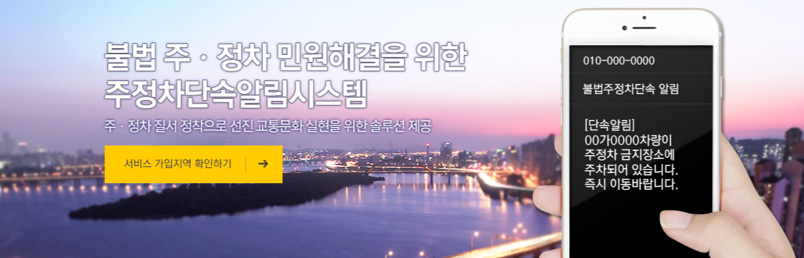 주정차단속알림시스템은 불법 주 · 정차지역의 차량에 대한 CCTV(고정식, 이동식)의 단속내용이 신청자 조회시스템과 연동하여 운전자에게 불법 주 · 정차에 대한 사전경고 안내 메시지를 발송하여 차량의 신속한 자진 이동을 유도하고, 주 · 정차 질서를 정착시켜 주는 솔루션을 제공하고 있습니다.