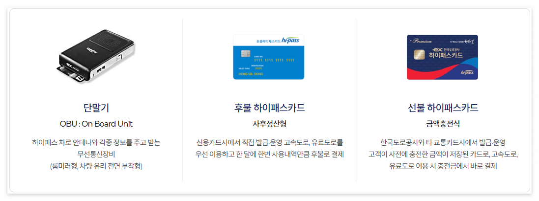 단말기에 하이패스 카드를 삽입 후 무선통신을 이용하여 하이패스 차로를 30km/h 이하로 무정차 주행하면서 통행료를 지불하는 최첨단 전자요금 수납시스템입니다.