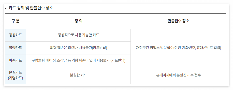 사용카드일 경우에는 최초 발급, 충전 후 1번이라도 사용한 카드는 환급기준 금액의 60% 이상 사용(1만 원 이하인 경우 80% 이상 사용) 한 경우에만 예금계좌로 환급이 가능합니다.(월 1회, 연 6회 초과 불과)