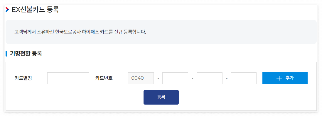 하이패스 차로 및 일반차로 모두 사용이 가능하며 모바일앱이나 휴게소에서 바로 충전도 가능합니다. 등록방법은 카드 구입 후 회원가입 및 로그인일 통해서 선불카드 등록이 가능합니다.