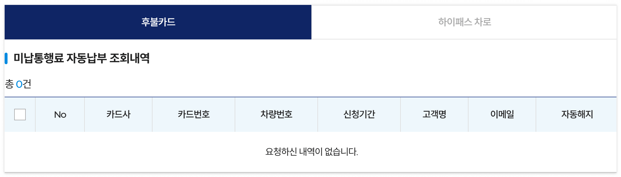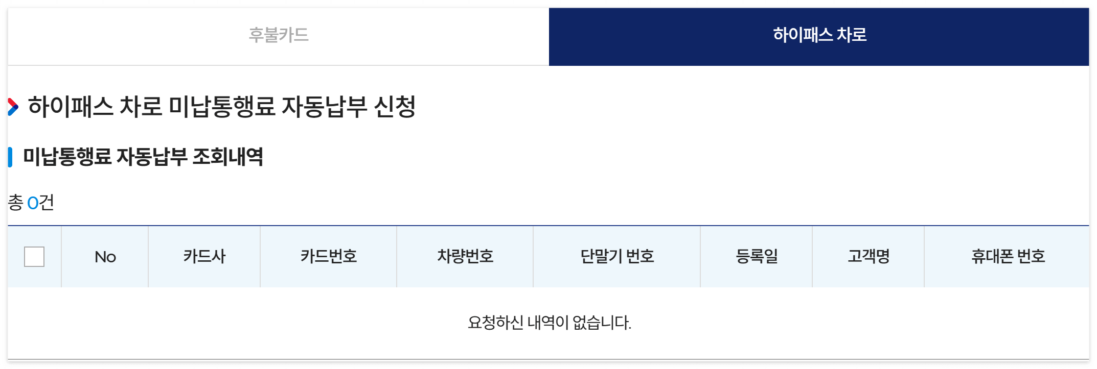 후불카드나 하이패스 차로 중에 선택하여 미납통행료 자동납부를 신청할 수 있고 납부 내역은 최대 3개월까지 조회가 가능합니다.