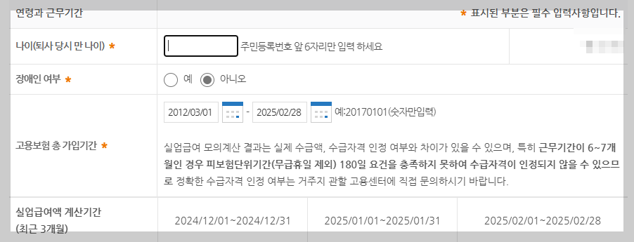 퇴사 당시 만 나이를 입력하고 장애인 여부, 고용제도 총 가입기간을 입력해야 합니다. 총 가입기간을 입력하면 실업급여액 계산기간이 자동으로 입력됩니다.