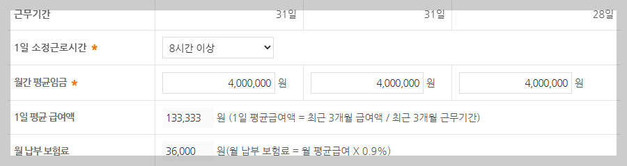 월간 평균임금을 입력하고 계산하기를 누르면 구직급여일액, 예상 지급일수, 총 예상 지급액을 확인할 수 있습니다.