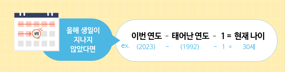 만 나이는 생일이 지나지 않은 경우와 올해 생일부터로 구분이 됩니다. 만 나이 계산기로 만 나이를 손 쉽게 계산할 수 있습니다. 해가 바뀌어 모두 다 같이 1월 1일에 1살씩 더하는 것이 아니라 각자 생일에 1살씩 더하면 됩니다.
