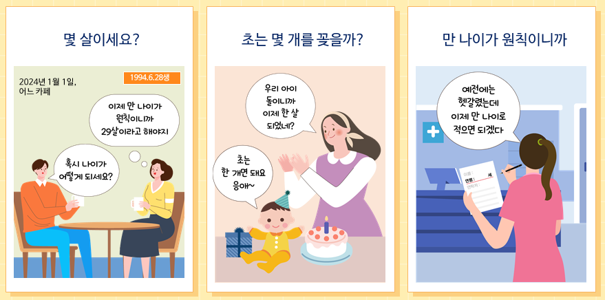 만 나이가 잘 정착이 될 수 있도록 일상생활에서도 만 나이를 사용하고 특별한 규정이 없으면 모든 법령, 계약서, 문서 등에 나오는 나이는 '만'자가 없어도 만 나이를 의미하니 확인하시기 바랍니다.