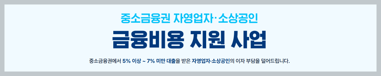 중소금융권 금융비용 지원 신청·조회 서비스 중소금융권에서 5% 이상 ~ 7% 미만 대출을 받은 자영업자·소상공인의 이자 부담을 덜어드립니다.