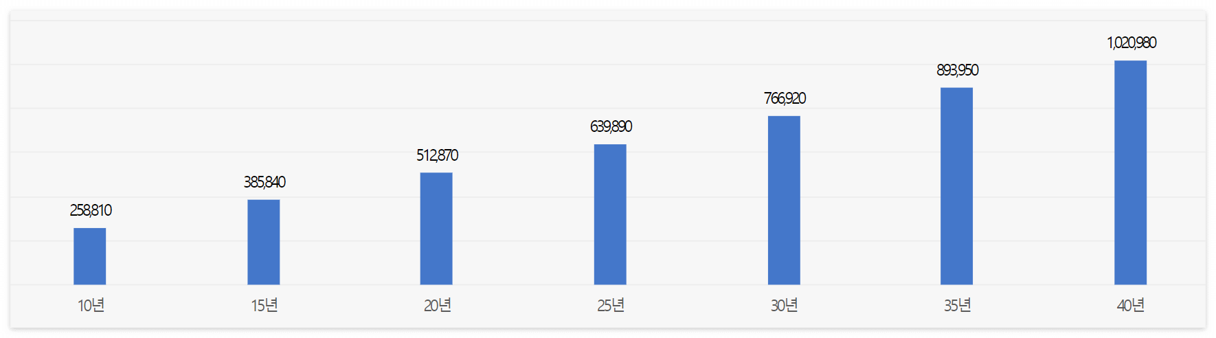 예를 들어 매월 20만 원으로 10년 가입하면 매월 받을 수 있는 연금은 258,810원으로 계산됩니다. 매월 개인이 정한 금액으로 가입연도를 설정해서 매달 받을 수 있는 연금을 조회해 볼 수 있습니다.