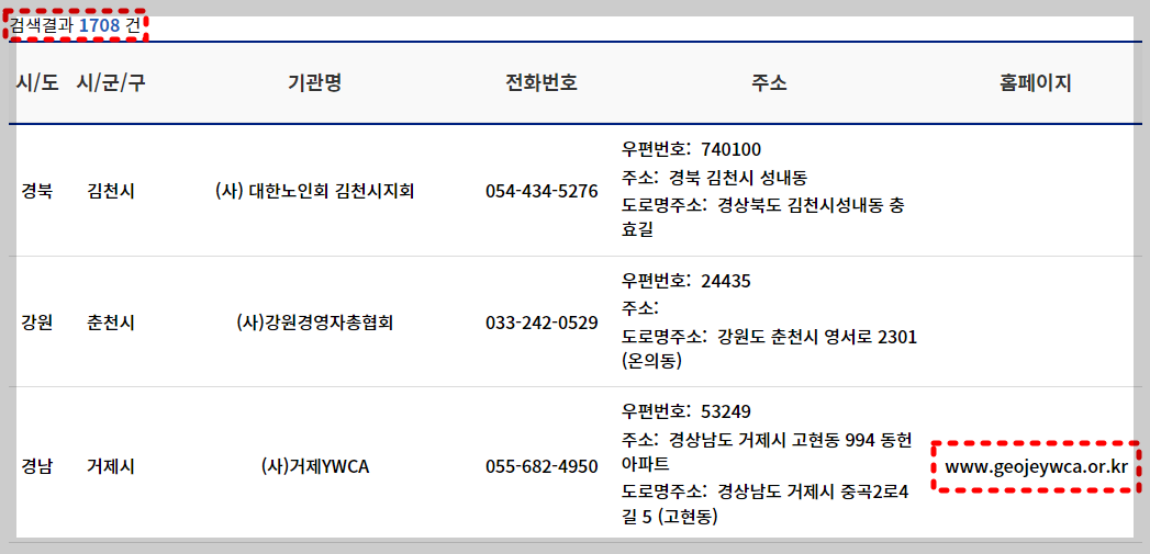 노인일자리에 참여하고자 하는 사람은 해당 지역을 선택하고 검색하거나 기관명으로 검색해 찾을 수 있습니다. 검색 후 시도의 기관명, 전화번호, 주소, 홈페이지 주소를 확인할 수 있으며 해당 홈페이지에 접속하면 다양한 구직 내용을 자세하게 볼 수 있습니다.