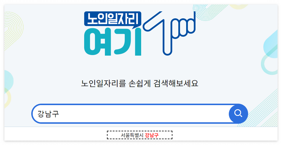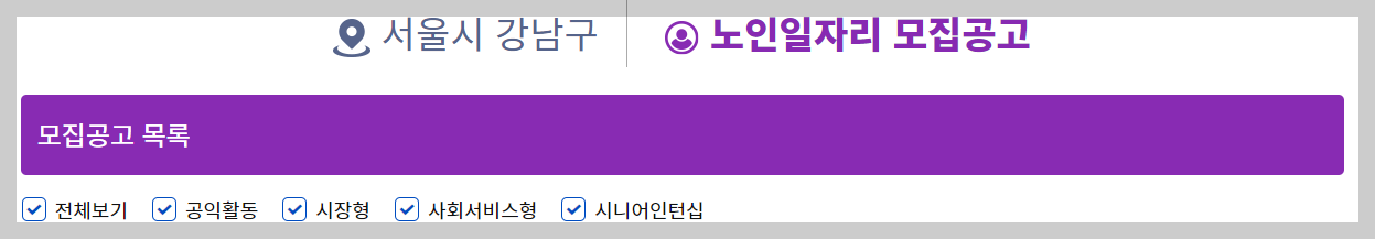 노인일자리 신청은 위와 같이 신청자의 해당 지역구를 입력하여 검색하면 거주하는 지역의 일자리 모집공고를 확인할 수 있습니다.