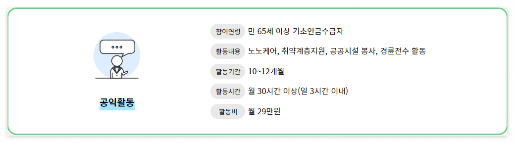 ✅ 활동내용: 노노케어, 취약계층지원, 공공시설 봉사, 경륜전수 활동