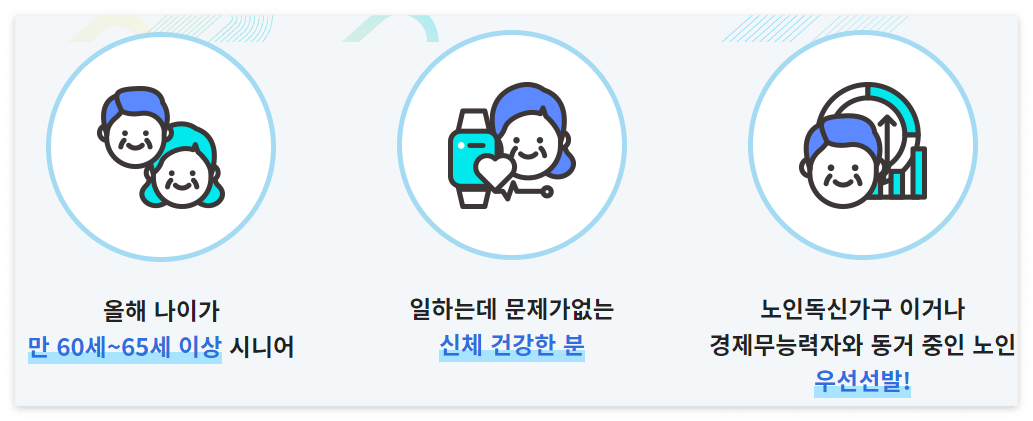 올해 나이가 만 60세에서 65세 이상의 시니어로 일하는데 문제가 없는 신체가 건강하고 노인독신가구이거나 경제무능력자와 동거 중인 노인이면 우선선발됩니다.