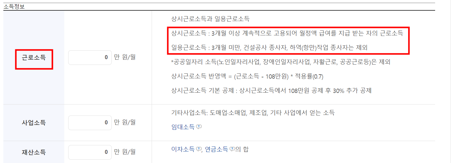 일용근로소득은 3개월 미만, 건설공사 종사자, 하역 항만 작업 종사자는 제외됩니다. 공공일자리 소득도 제외되며 상시근로소득 반영액은 인정이 되니 확인하시기 바랍니다.
