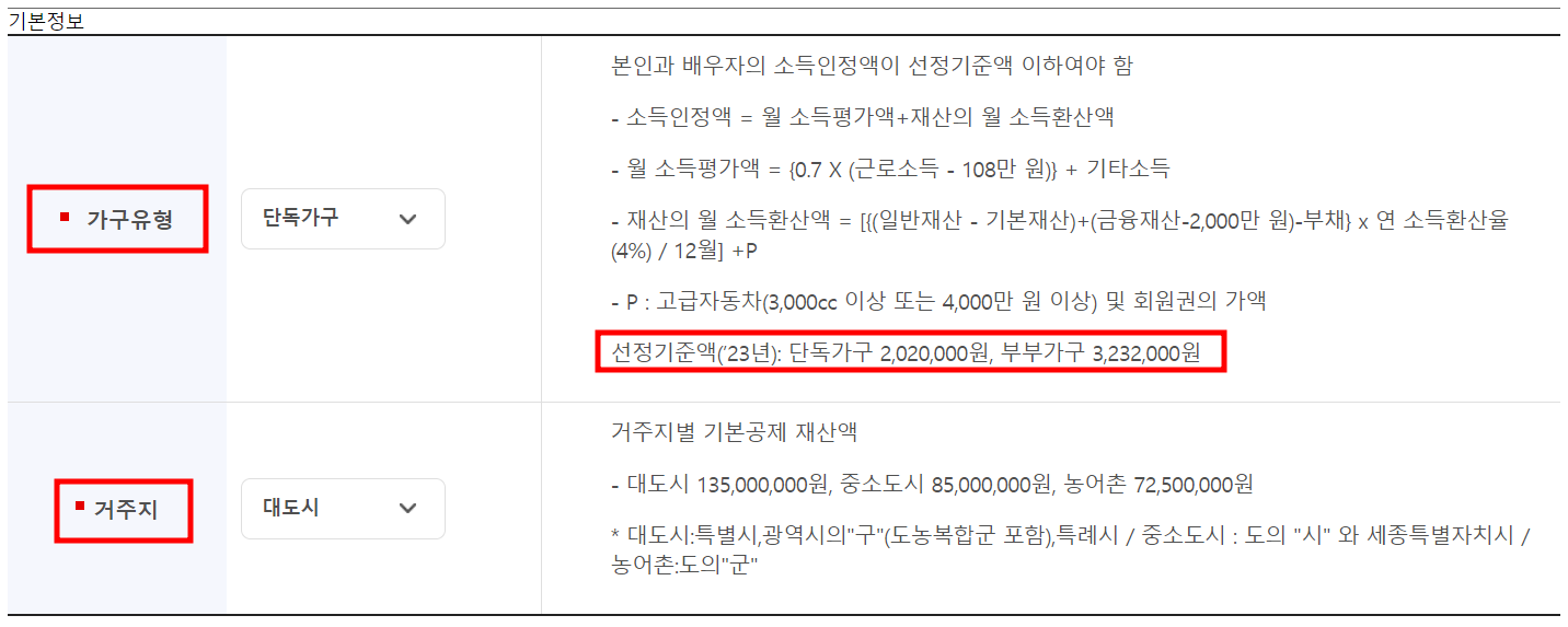 가구 유형은 본인과 배우자의 소득인정액이 선정기준액 이하여야 하며 월 소득평가액과 재산의 월 소득환산액을 합산한 금액이 소득인정액입니다.
