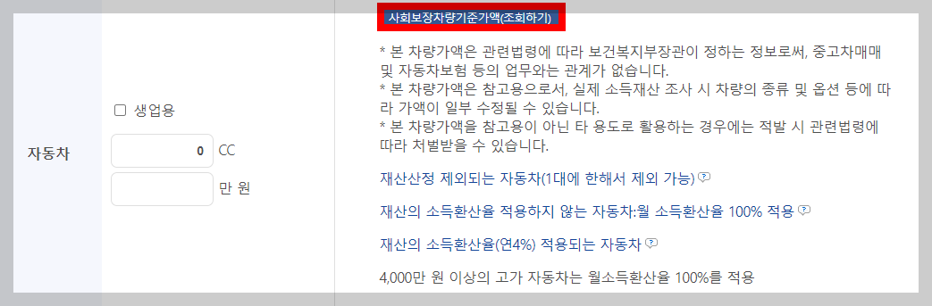 일반재산인 자동차의 차량가액에 따라서도 재산산정에서 기준이 됩니다. 사회보장차량기준가액을 조회하여 차량명과 연식에 따라 검색도 가능합니다.