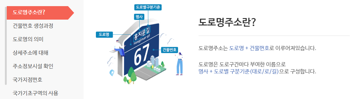 도로명주소는 도로명과 건물번호가 조합되어 이루어진 것으로 도로명은 도로구간마다 부여한 이름으로 되어 있으며 명사와 도로별 구분기준으로 구성되어 있습니다.