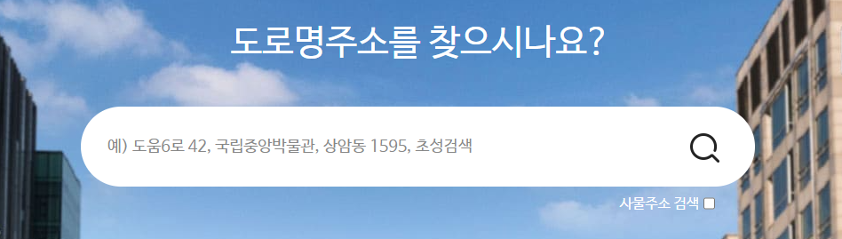 도로명주소를 찾기 위해서는 검색창에 찾고자 하는 동과 지번을 입력하면 검색이 가능합니다. 하지만 지번을 모를 경우에도 동과 건물이름을 입력하면 검색결과를 확인할 수 있습니다.