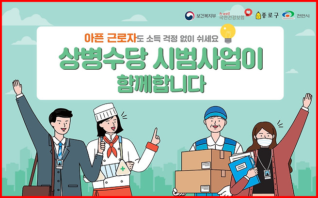 일하다 아프면 맘 편히 몸 편히 쉬고 1인당 평균 18.5일, 84.7만 원 상병수당 지급을 신청하시기 바랍니다.