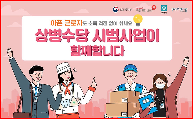 상병수당이란 질병이나 부상으로 경제활동이 어려울 때 신청할 수 있는 것으로 근로활동이 불가한 기간 중 최대 150일까지 1인당 4만 7560원의 수당 지급이 가능합니다.