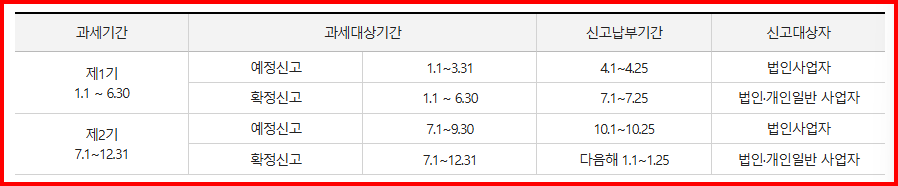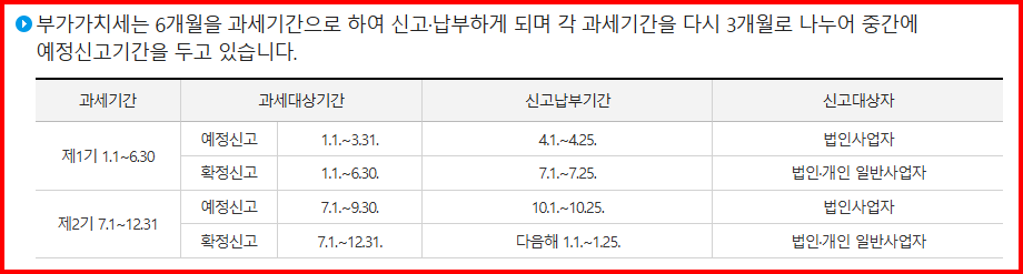 부가가치세는 6개월을 과세기간으로 하여 신고 및 납부하게 되며 각 과세기간을 다시 3개월로 나누어 납부하므로 중간에 예정신고기간을 확인하시기 바랍니다.