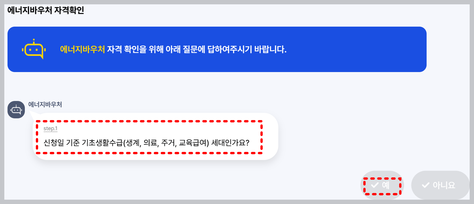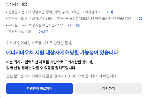 에너지바우처 모의계산이란 에너지바우처 지원대상 여부를 자가진단할 수 있는 서비스입니다. 자격 확인을 위해 몇 가지 질문에 대한 대답을 입력하면 즉시 지원대상 여부 조회가 가능합니다.