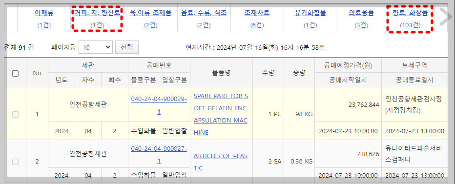 향료 및 화장품의 공매 개수가 103건으로 확인되며 확인을 해보니 아래와 같이 공매횟수, 세관명, 공매예정가격, 보세구역을 확인할 수 있습니다.