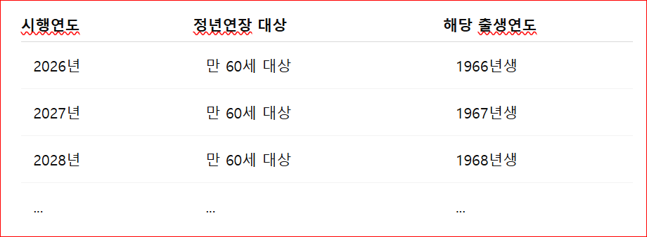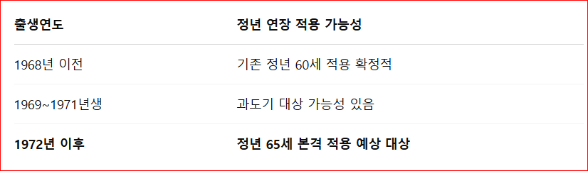 아직 확정은 아니지만, 정년연장 65세가 2026년부터 시행될 경우, 1966년생부터 적용될 가능성이 높으며 출생연도별 적용 대상을 확인하시기 바랍니다.